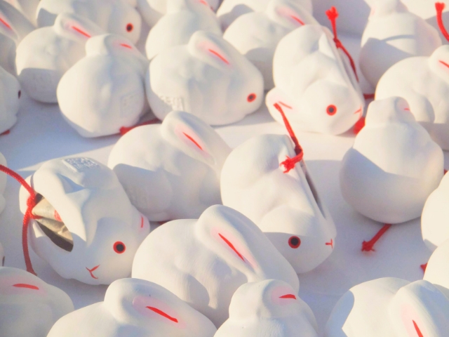 神話への登場からも、神社の境内で見かけることは多い動物。埼玉県さいたま市の調神社では狛犬代わりにウサギが置かれていたり、大阪府大阪市住吉区の住吉大社ではウサギおみくじや撫でウサギがあったり、京都府京都市左京区の岡崎神社や、島根県出雲市の出雲大社は境内のあちこちにウサギの石像があったり。今年はウサギに関わる神社に初詣するのも良さそうですね。