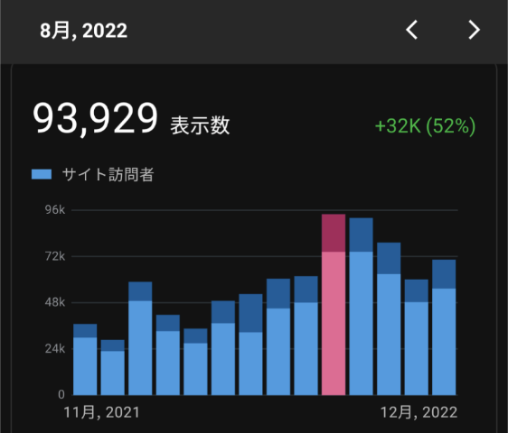 これまで最高値だった2021年10月の50,000PVをあっさり超えて、2022年8月に90,000PV越え!これは嬉しいです。目標の100,000PV!と言いたいところですが、狙いすぎると少しコンセプトとずれそうなのでほどほどにします。