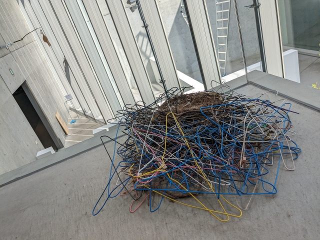 こちらはなんと世田谷区で集収されたカラスの巣。人間がつくりだしたハンガーがマテリアルに。木の枝ではできない「曲げる」工程が含まれた、カラスによるデザインです。