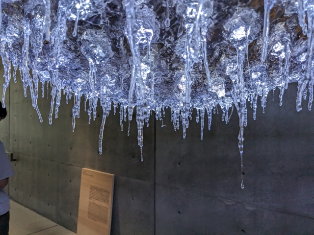 こちらは《glow ⇄ grow: globe》by TAKT PROJECT。この企画展のディレクターである吉泉聡が代表をつとめるデザインスタジオによる作品です。光でかたまる硬化性樹脂であるため、LEDの光で姿を変えながら成長していく作品。よく見ると、下には雫となって落下したプラスチックが・・・!