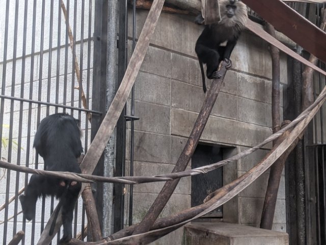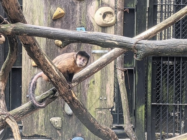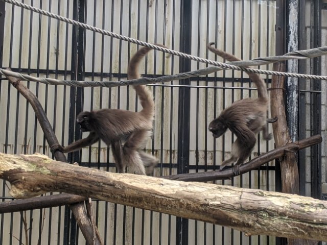 動物園で見ごたえがある動物と言えばサル。颯爽と駆け抜けるのはブラウンケナガクモザル。手と足に加えて尻尾でもロープを掴んでいます。しなやかな動きはずっと見ていられそうです。