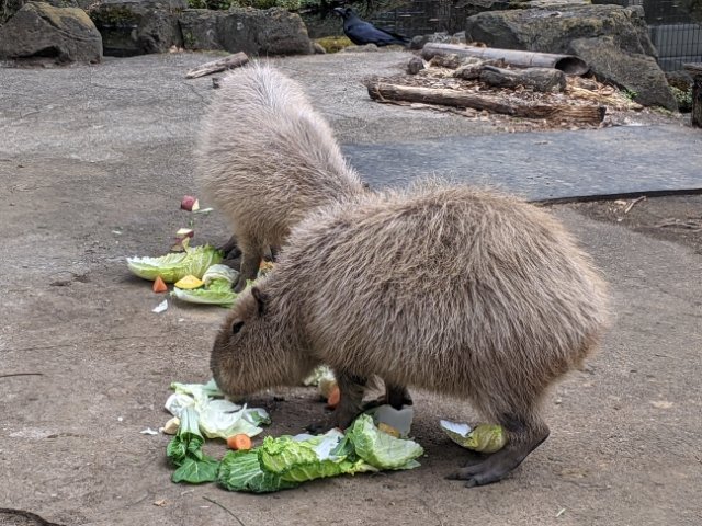 飼育されている動物たちも思った以上に豪華。人気者のカピバラは、オスとメスの2匹が展示されています。ハクサイやサツマイモなど、むしゃむしゃと食事中でした。