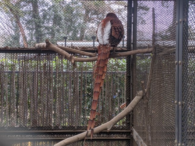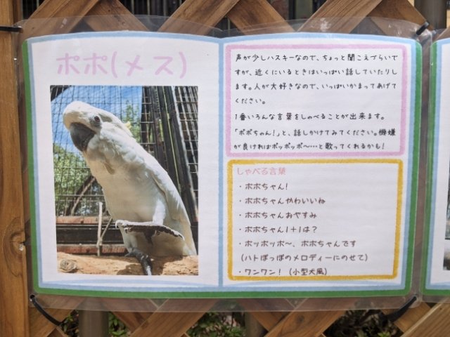 オオバタン、タイハクオウム、ベニコンゴウインコなど華やかな鳥も多数飼育されています。しかし、2022年1月現在、鳥インフルエンザの感染予防として展示を中止中。貼られていた展示によると、アオメキバタンのポポちゃんはいろいろな言葉を喋れる様子。そのレパートリーは「ポポちゃんかわいいね」「ワンワン」などなど。ぜひ聞いてみたかったです。