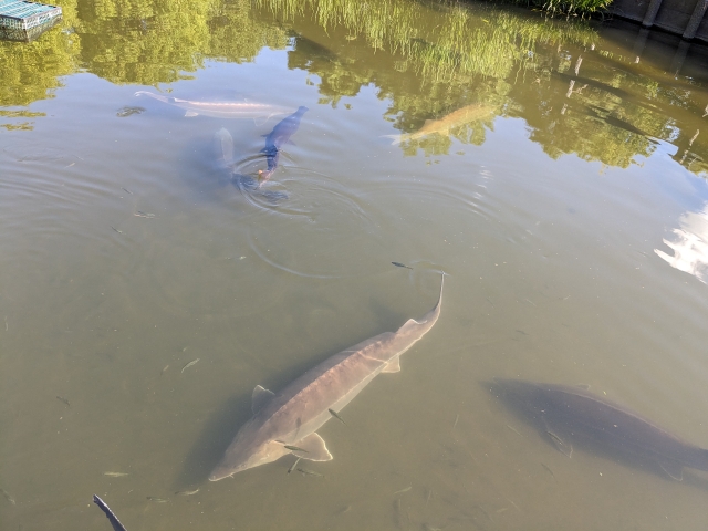 庭池は複数あり、こちらはなんとチョウザメ池。1mを超える大きさのチョウザメたちが悠々と泳いでいます。