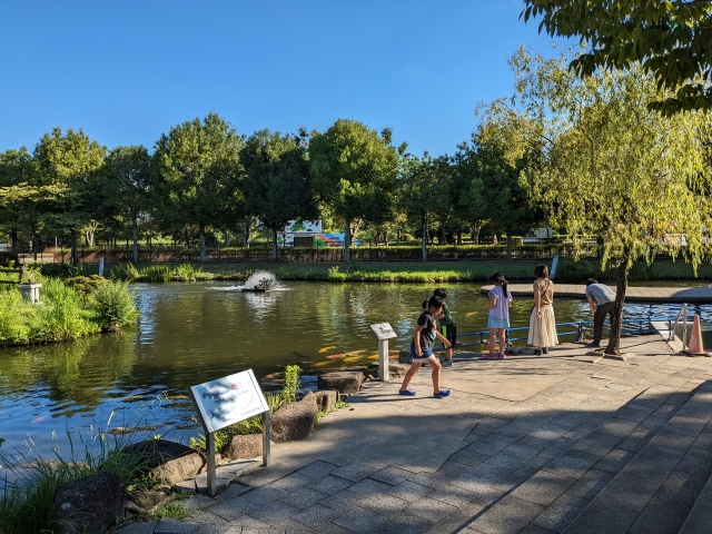 ここに泳いでいるのは、レッドコロソマ、ナイルティラピア、ソードテールといった外国産の熱帯魚たち!いずれも水族館では見かけることの多い定番熱帯魚ですが、このように屋外の池で泳いでいるのは初めて見ました!きっとサカナたちの故郷である現地の池でもこんな風に上から見られているのでしょうね。