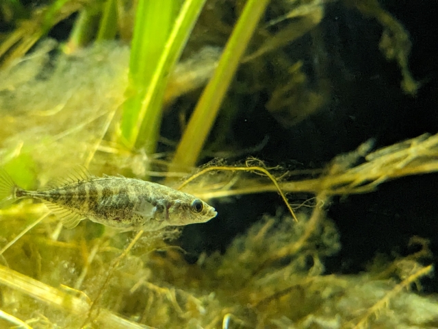 水草の隙間を泳ぐムサシトミヨは、水草を使ってピンポン玉サイズの巣をつくるユニークな習性を持っています。このサカナ、現在残っているのは地球上で埼玉県のみ!1991年に埼玉県のサカナにも指定されました。