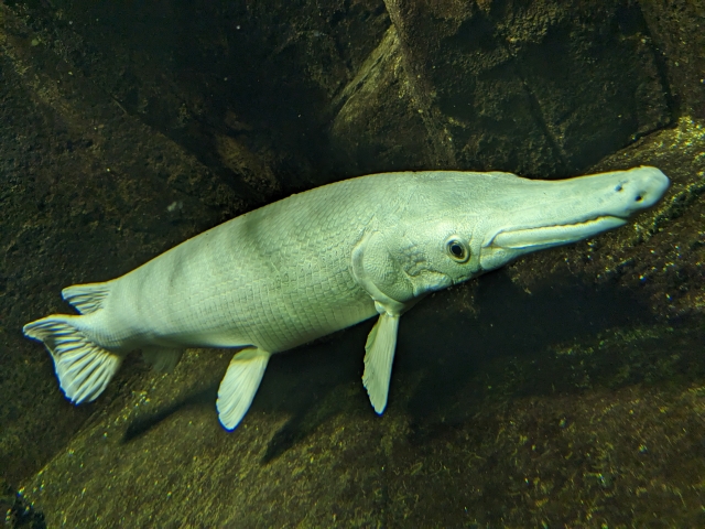 北米産の魚、アリゲーターガー。ここでは真っ白な個体が展示されています。アルビノとは異なりメラニンを作ることができる白変種と呼ばれるタイプ。なんだか神秘的な姿に見とれてしまいますね。