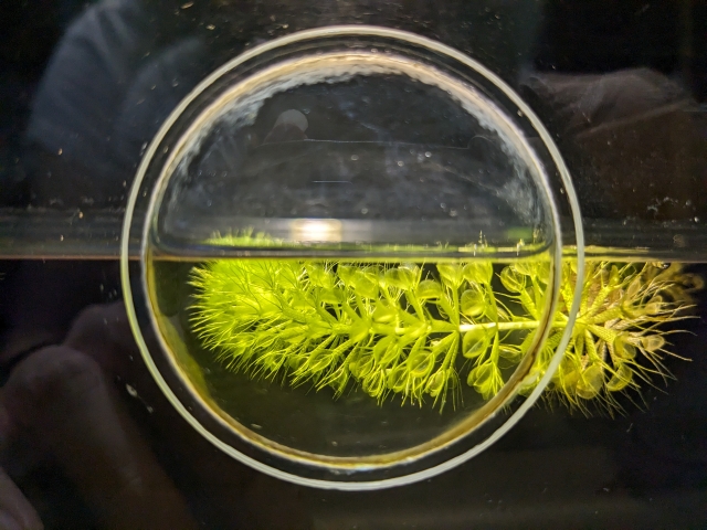 こちらの水草はムジナモという、珍しい水生の食虫植物。散らばっているように見えますが、このように水に漂い昆虫やプランクトンを捕食するのです。そのスピードは1/100秒というとんでもない速さであるそう。