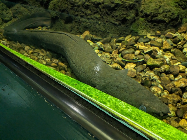 その名に違わず巨体で横たわるオオウナギ。大きいウナギではなく、そういう名前の種類で、最大で220cmにもなるそう。利根川以西に分布するため関東でも見ることができるそうですが、寒さに弱いため越冬できないことも多いようです。