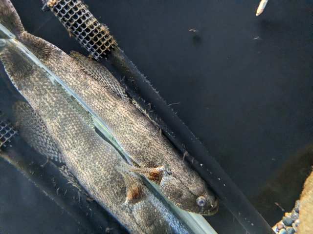水槽とパイプの隙間にぴったりとハマったカワアナゴ。名前にアナゴと付きますが、あのアナゴのは別種のサカナ。垂直にぴんと伸びた姿はまるで身長測定しているみたいです。