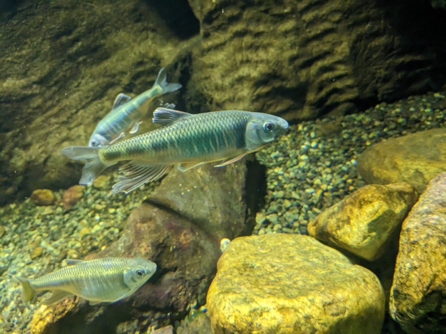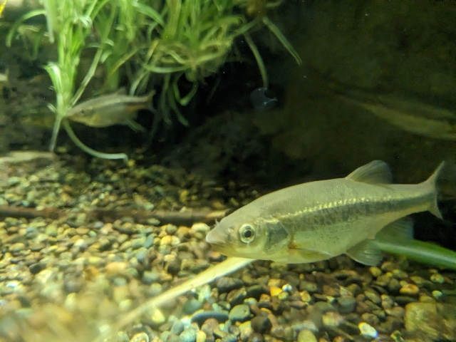 ここからは、より生き物にクローズアップして紹介していきたいと思います!まずは黒いラインが特徴的なアブラハヤ。さわると油のようにぬるぬるしているそうです。さわってみたいけど、ちょっとこわいです。