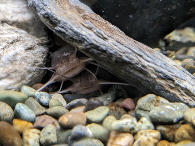 岩の隙間に詰まっているのはアカザという素晴らしい提案をしてくれそうな名前のサカナ。10cm程度の小型のナマズで、赤みがかった体が特徴です。ちなみに背ビレと胸ビレの間にはトゲが生えており、毒を持っているそう。