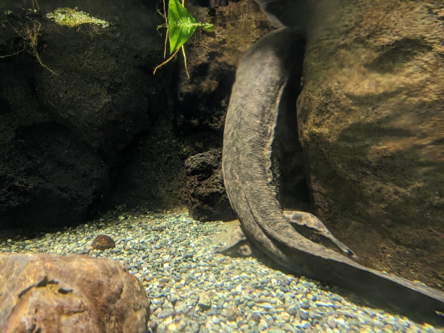 海水魚に比べると色合いも形状もシンプルな淡水生物ですが、見ごたえのある生き物も多数飼育されています。その筆頭は、岩に頭を突っ込んだ不思議なポージングのオオサンショウウオ。岐阜県以西に棲むため関東では見られない生き物です。