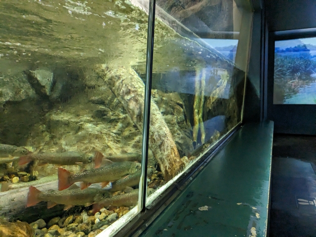 渓流の環境が再現された上流域の水槽に泳ぐのはニッコウイワナ、サクラマス、ニジマスなど、上流域のサカナたち。