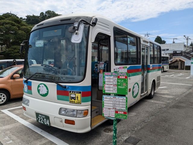 真鶴駅から出るバス「ケープ真鶴線」に乗れば、①琴ヶ浜(里地)まで約7分、②三ツ石海岸(ケープ真鶴)まで約20分ほど。土日祝日は本数が少なく1日8本ほど。特に12時台だけ空白になるので要注意。ちなみに、帰りの最終バスは土日祝日でケープ真鶴16:29発になります。