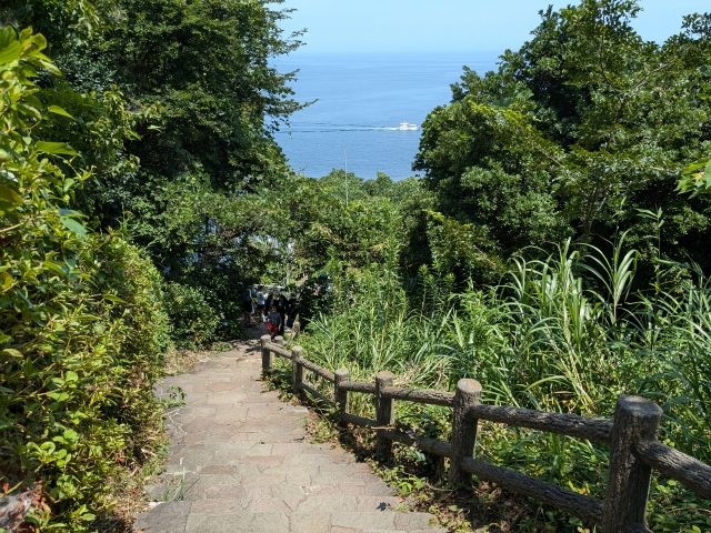 ケープ真鶴から三ツ石海岸までは、階段をひたすら降りて行きます。夏場はなかなかハード。特にテントやクーラーボックスなど大荷物の方はかなり過酷な道のりです。