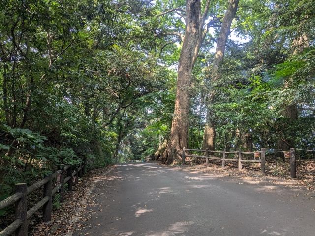 琴ヶ浜から三ツ石海岸まではしばらく上り坂ですが、電動なのですいすい進めます。木々が生い茂る道を走るのは心地よいです。