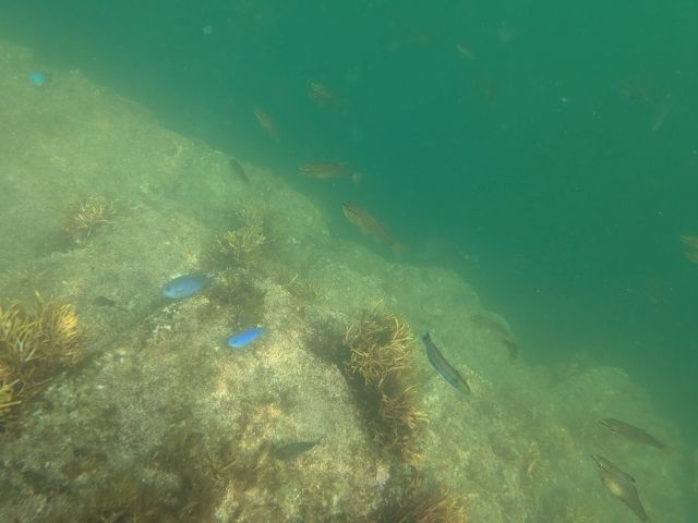 沖に突き出した「サザエ根」と呼ばれる岩場がシンボル。その周辺にはキュウセン、ルリスズメダイ、タカハタダイなどがたっぷり。ただし、潮が満ちるタイミングだっためか水はけっこう濁っておりました。