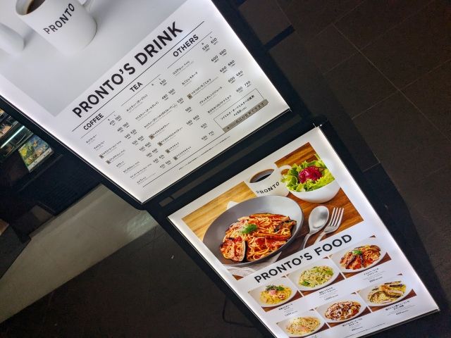 ドリンクはソフトドリンク770円〜とちょっぴりお高め。フードメニューもあり、「和風カルボナーラ」や「海老とアボカドのバジルソース」などのパスタ、「抹茶バスクチーズケーキ」や「白いコーヒープリン」などのデザートがあります。カフェはプロントが運営しているので、メニューもプロント仕様です。