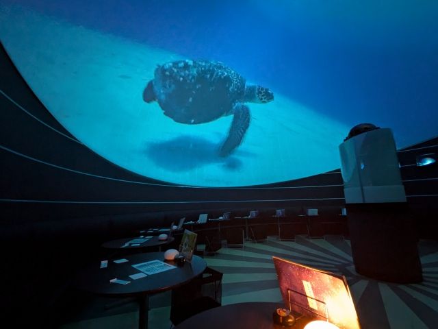 最初に見たのは「海と星空の散歩道」。様々な生き物が泳ぐ海の中を映した15分の作品です。華やかなサンゴ礁やサカナを映した雰囲気モノかと思いきや、日本語と英語のナレーション付き。生き物解説というよりは語り系で、雰囲気抜群。アオウミガメやオニイトマキエイ、さらには大航海時代をイメージした星空解説もありました。