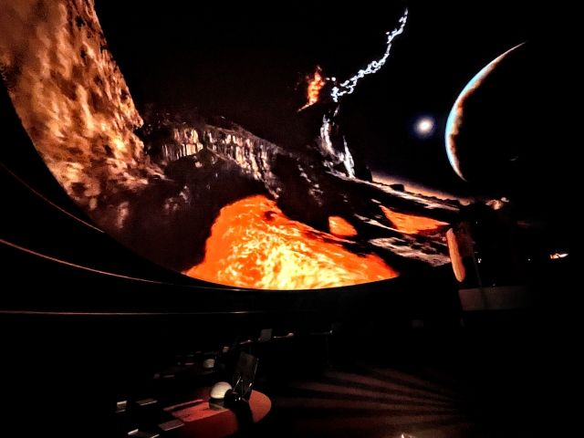 ドームには探査機ボイジャー1号と2号が見た太陽系の惑星が映し出されます。惑星やその衛星の外観だけでなく、星たちの気候や地形も描かれており、とってもファンタジック。