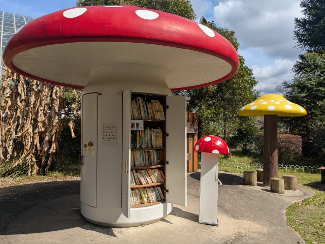 立ち並ぶのはかわいらしいキノコ。備え付けられた扉を開くと、そこには本が入っています。