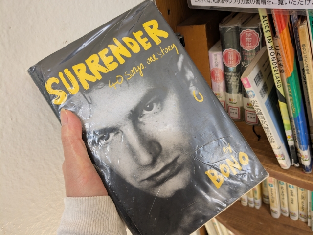 その5冊、実際に手に取ることができます。これは、アイルランドのロックバンドU2のボーカル・ボノによる「Surrender: Bono Autobiography: 40 Songs, One Story」だ!