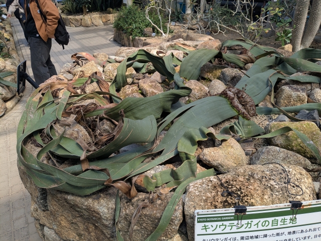 一度聴いたら忘れられない名前のキソウテンガイ。葉は2枚だけしかつかない植物なので、ここでは何株もあつまっているようです。寿命は驚愕の1000年!!
