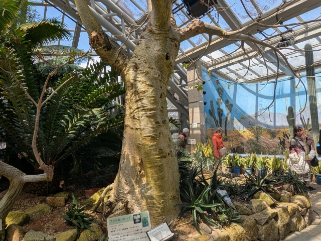 アフリカバオバブも展示されています。大量の水を蓄えるため直径10mまで太るという樹木。夜に開花し、コウモリが花粉を運ぶそう。