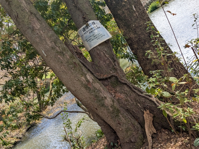 半木神社の東側、橋を渡った小島には、「連理の枝」と呼ばれる木があります。こちらはモミとムクノキが融合している非常に珍しい状態の樹木。その姿から、恋愛スポットにもなっているそうです。