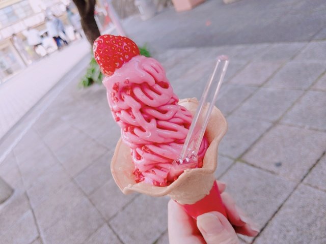 とっても濃いピンク色をしたソフトクリーム。程よい酸味とイチゴの甘さがバランスの良いスイーツです。てっぺんにイチゴがそのまま乗っかっているのがかわいいです。とにかく写真映えする人気No.1メニューで、街中でも食べ歩きしている人をたくさん見かけました。