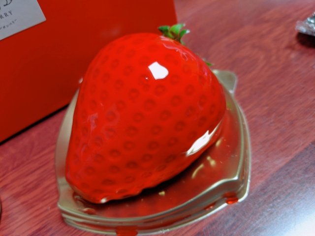 長さ7cmほどの大きなイチゴの形をした、インパクト抜群なババロア。イチゴゼリーでコーティングされており、揺らすとプルプルと動きます。ポイントはイチゴのヘタが付いていること。これ、お菓子で作ったダミーではなく、なんとホンモノのイチゴの葉っぱ。食べることはできませんが、充分すぎるリアル感をプラスしてくれます。