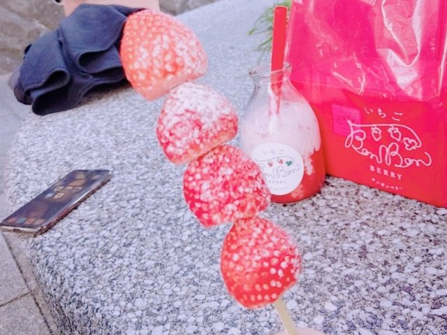 串に刺さったイチゴ。それ以上でもそれ以下でもなく、思った通りの味がします。いちごに砂糖をかけて食べるのはちょっとだけ新鮮。お腹がいっぱいで立ち寄った時は、デザート代わりに軽く行けます。