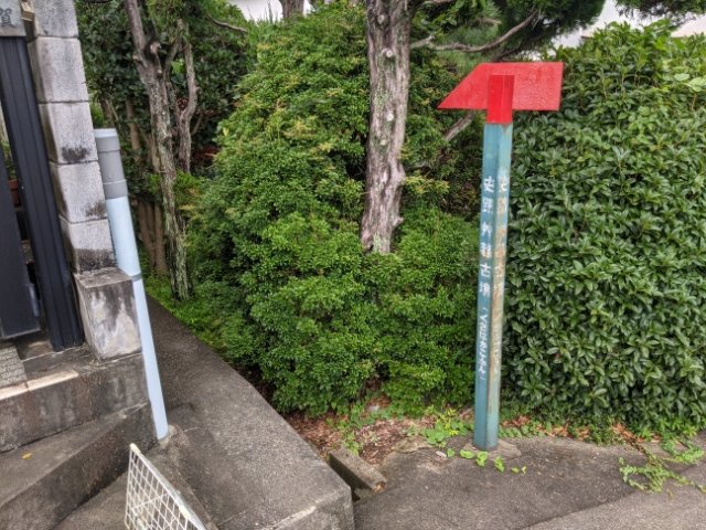 住宅地の中にあるのですが、そもそも道路に面していません。そのため、住宅街の家と家の間を進みます。一応、小さな案内板(写真左上)は出ていました。