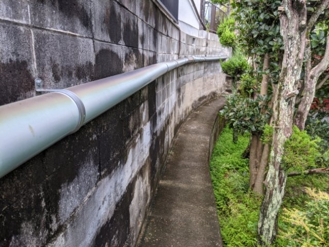 さらに、矢印はこんなわずかな隙間へ。通路とも呼べないような塀の脇を通り抜けていきます。