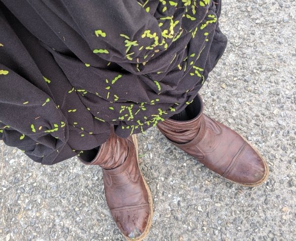 古墳から戻ると、服には草の種がびっしり!こちらはヌスビトハギという植物で、かなりしっかりと衣類にくっつきます。化学繊維ならば割と簡単に撮れるのですが、綿100%でしかも形状が複雑な服で来てしまったので困難を究めます。全部取り外すのに恐ろしいほど時間がかかりました・・・。
