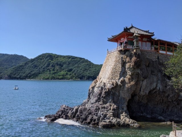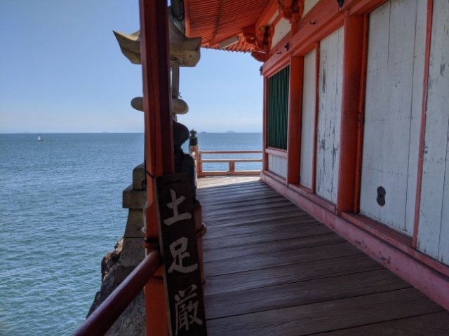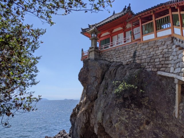 阿伏(あぶと)岬の断崖の上に建てられた朱塗りのお堂。階段を登っていけば、お堂に上がることもできます。とにかく爽快ですが、一歩間違えれば海の中へ真っ逆さまというスリルも体験できます。