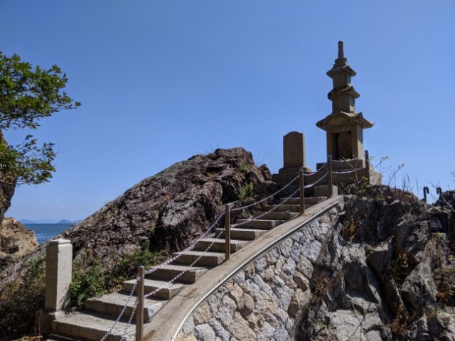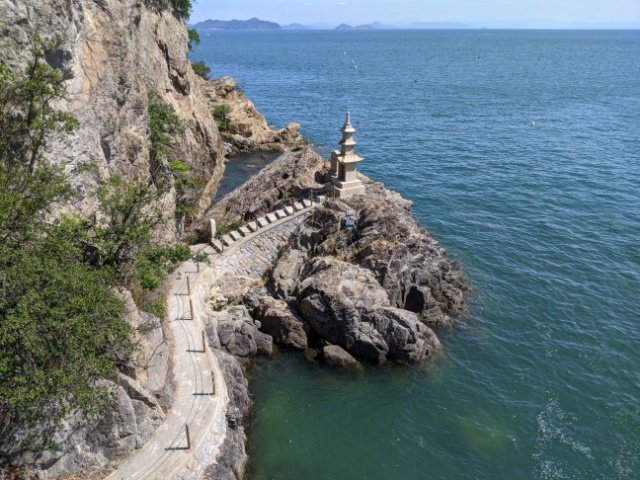 なお、この石塔は観音堂のビュースポットでもあります。ここから見ると、海上にせり立つ崖の上に造られた荘厳な様子を感じ取ることができます。