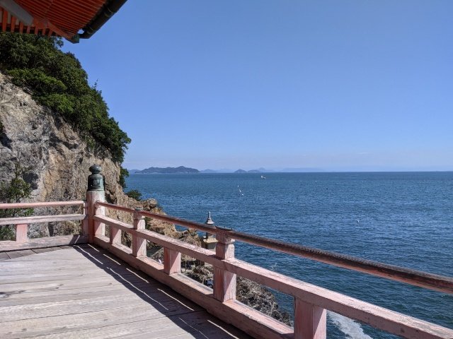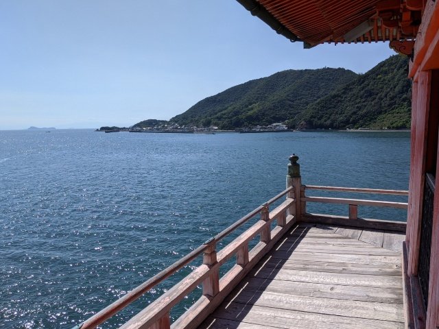 海上にせり立つお堂は爽快感が果てしない!吹き抜ける海風はかなり強いですが、暑い日にはとっても心地良い。周囲には広がる瀬戸内海と、そこに浮かぶ仙酔島や田島などの島々がよく見えます。