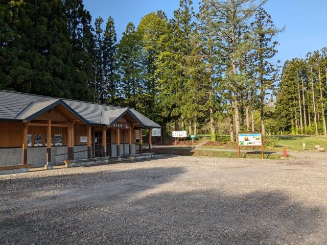 駐車場に到着。GWなので混雑回避のため早めの時間にやってきました。駐車場には網戸付きのトイレと案内板があります。道中にトイレはないので、ここで済ませておきましょう。