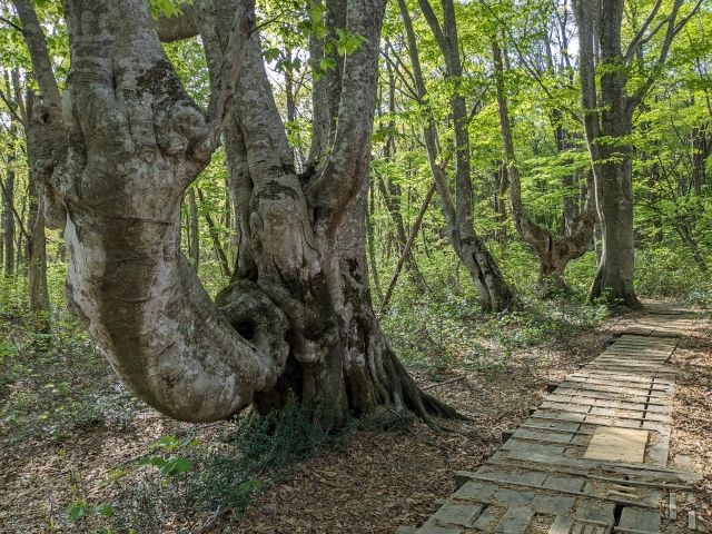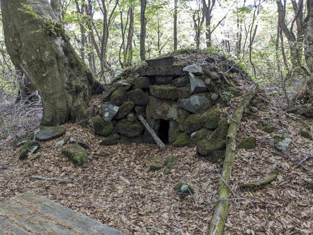 唐突に現れる石が積まれた建造物。こちらは「炭焼き窯」。江戸時代末期よりブナの森を利用した炭焼きが行われており、26個の炭窯があったそう。ブナを伐採する際に、再度萌芽するように何本かは残していたそうですが、それが奇形の原因になったとも考えられています。