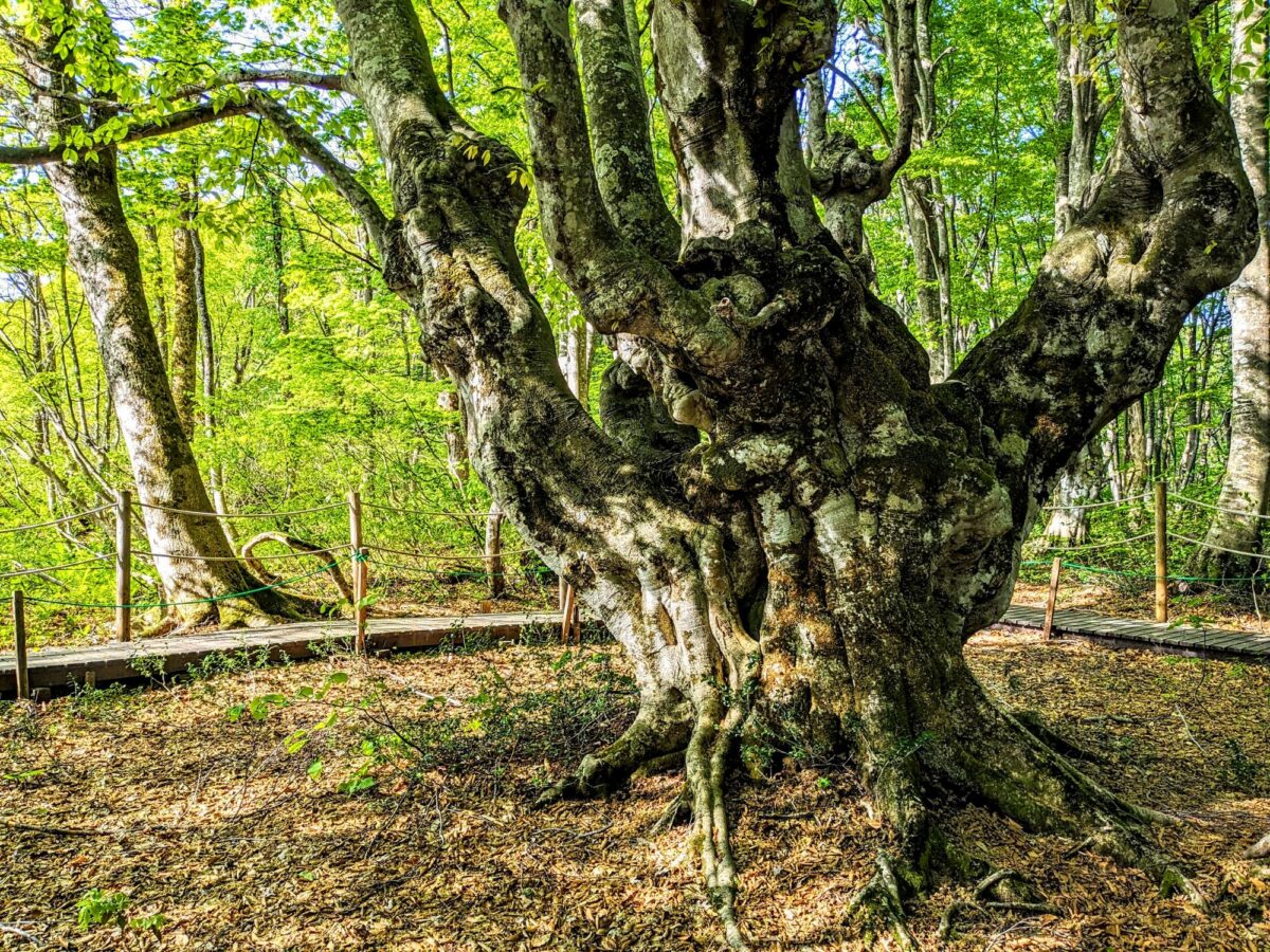 駐車場から歩くこと約30分、ついに「あがりこ大王」に到着しました。幹周7.62m、樹高25m、推定樹齢は300年以上というブナの巨樹。周辺に多く見られるブナの奇形木としては最大級であるそう。