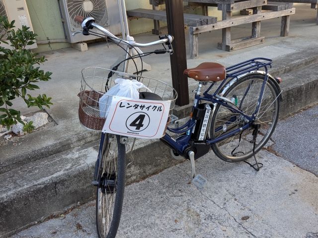 往復の手段が決まれば、あとは島での移動手段。徒歩でも気合いでまわれなくない規模ですが、「レンタカー」か「電動自転車」が一般的なようです。いずれも港から10分ほどの観光協会にてレンタル可能。