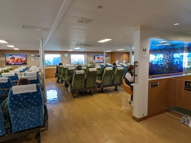 ニューフェリーあぐには2020年7月15日から就航開始した新造船。船内はまだまだキレイ!