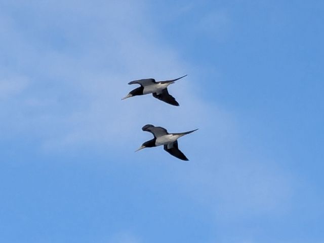どこからか現れた2羽のカツオドリは、揺れるように船に沿って飛び続けています。島へよく行くというおじさんの話によると、船に驚いて飛び跳ねるサカナを狙っているそう。