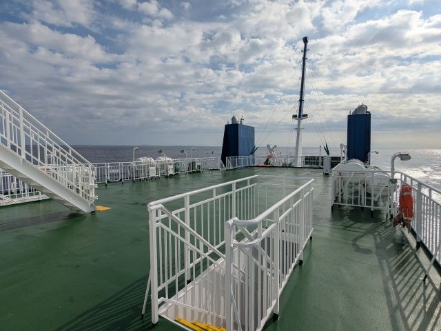サンデッキで眺めを楽しんでいたところ、沖へ出たあたりで船がかなり揺れはじめました!