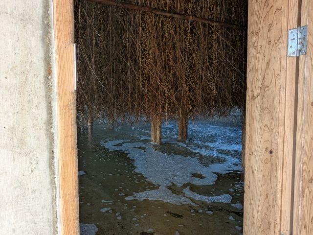見学に参加すれは、中身もちらっと見せてもらえます。扉の向こうは、無数に垂れ下がる竹から滴りおちる不思議な景観。まるでエレベーターで異世界の扉を開いてしまったかのような感覚でした。