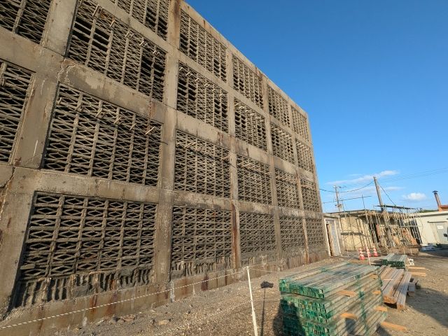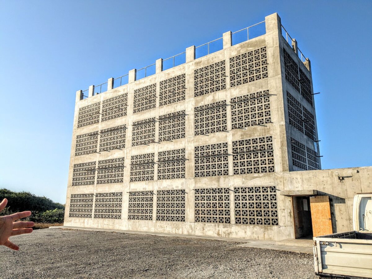 穴開きブロックを積み上げた、高さ10mの建物。合計3基が稼働しており、今年できたばかりの最新棟もあります。