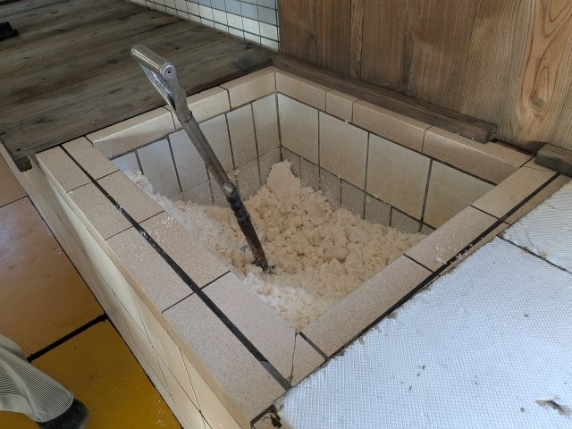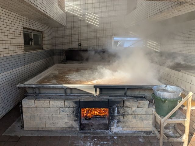 濃縮した海水は、こちらの平釜へ。ここで約30時間かけてゆっくり煮詰めます。常にかき混ぜて焦げつきを防ぐ必要があり、交代制で作業するそう。