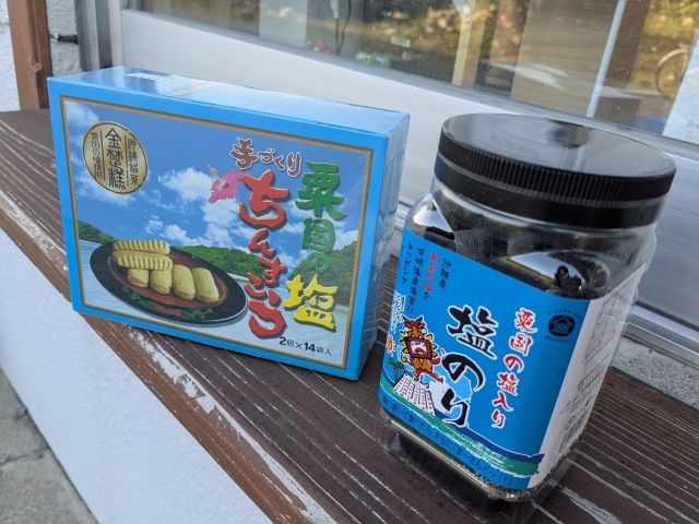 さらにここで作られた塩やにがりも販売。「粟国の塩入り塩のり」と「粟国の塩ちんすこう」を買ってしまいました!